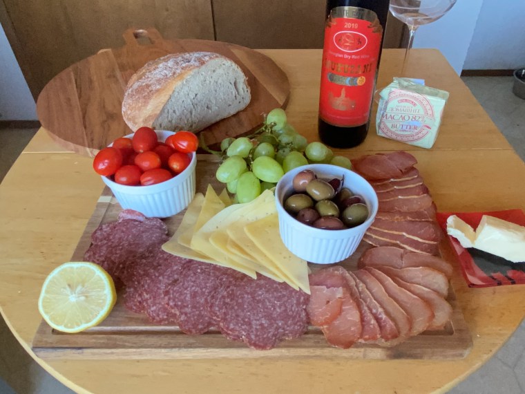 Arrange on wood plank, serve with butter, olives and grapes