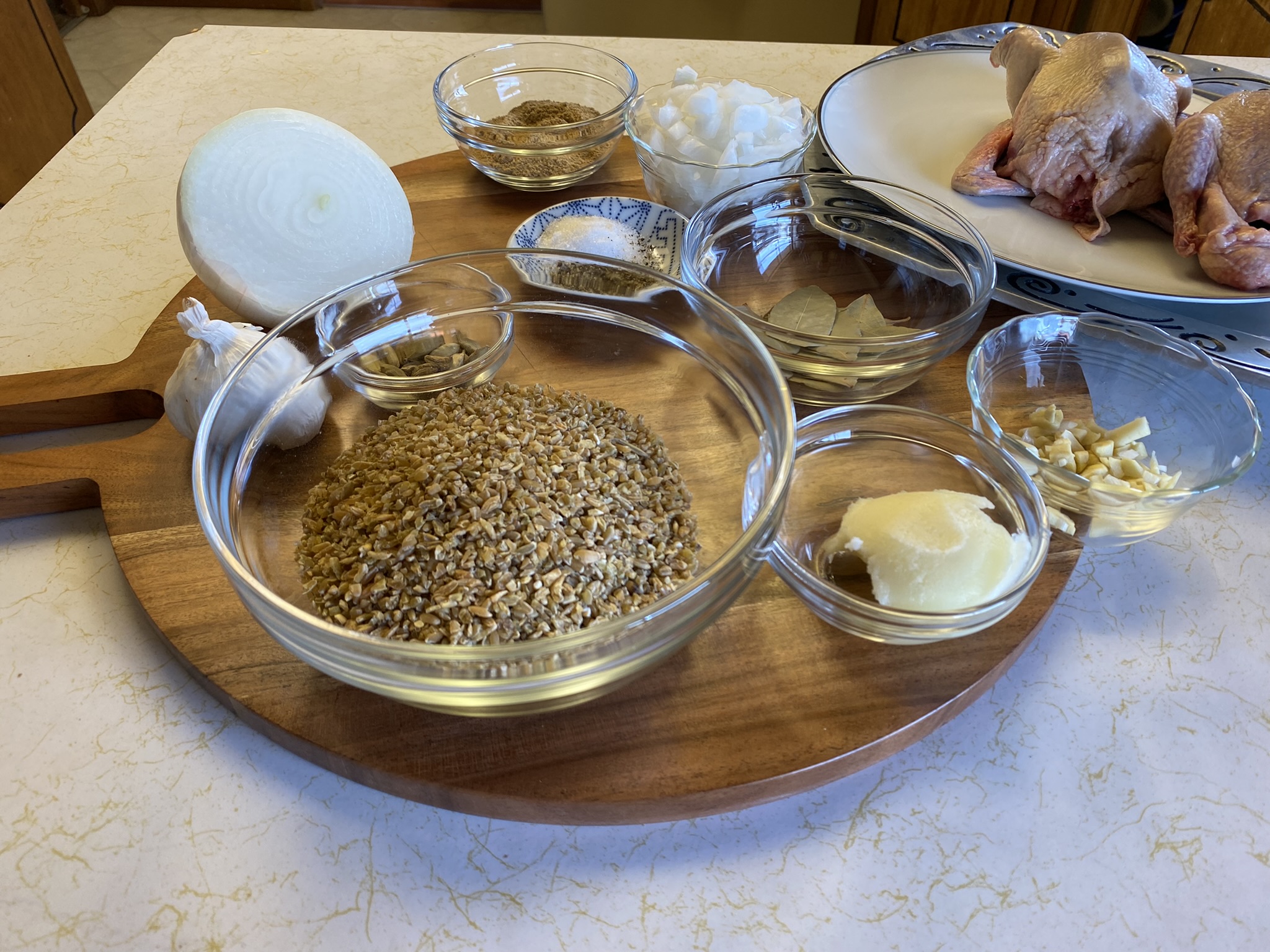 Arrange on wood plank, serve with butter, olives and grapes